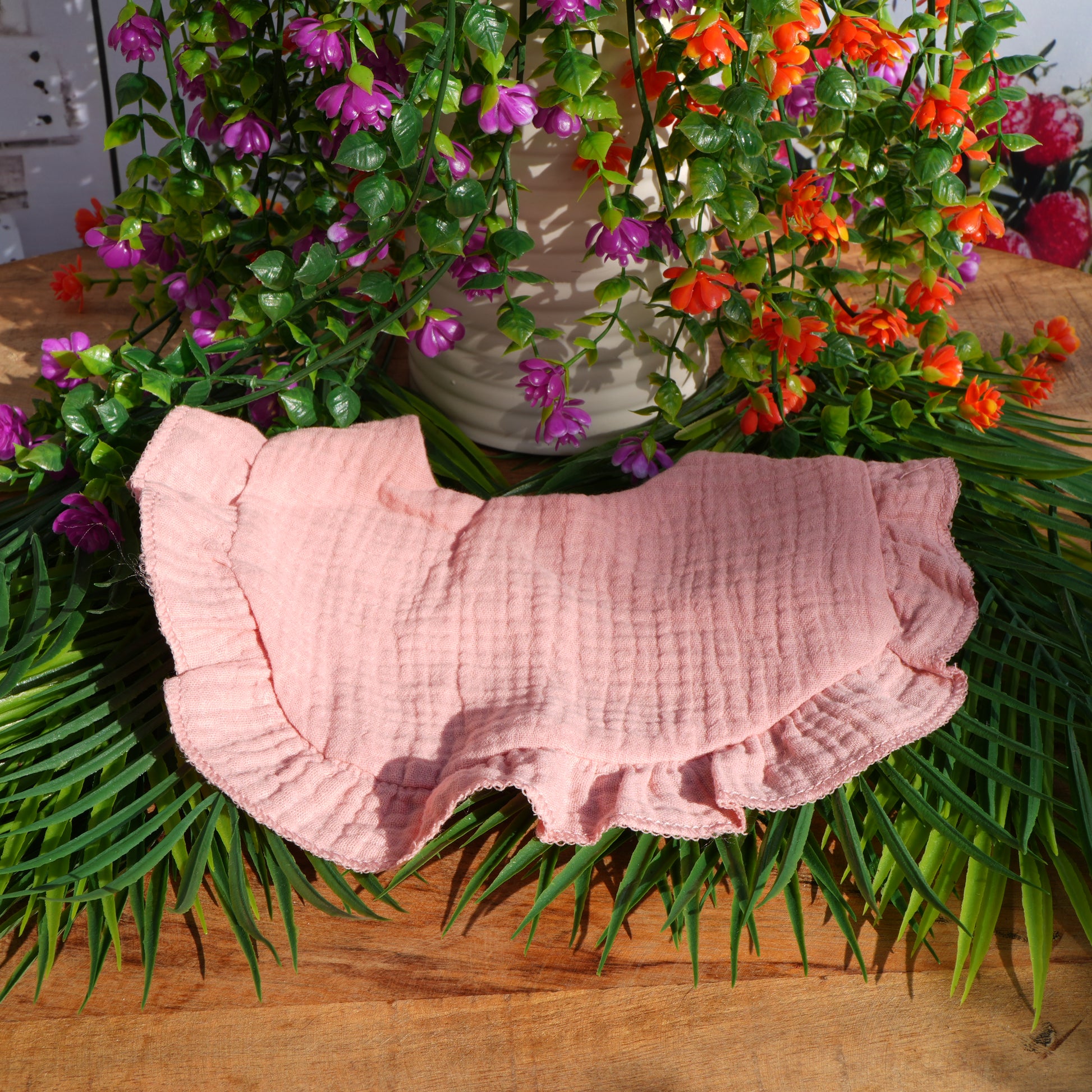 Gemaakt van zacht katoen en dubbel laags. Absorberend en afgewerkt met een ruche. en drukknoop sluiting.