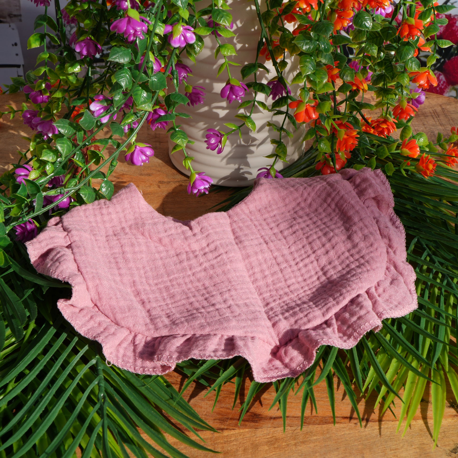 Gemaakt van zacht katoen en dubbel laags. Absorberend en afgewerkt met een ruche. en drukknoop sluiting.