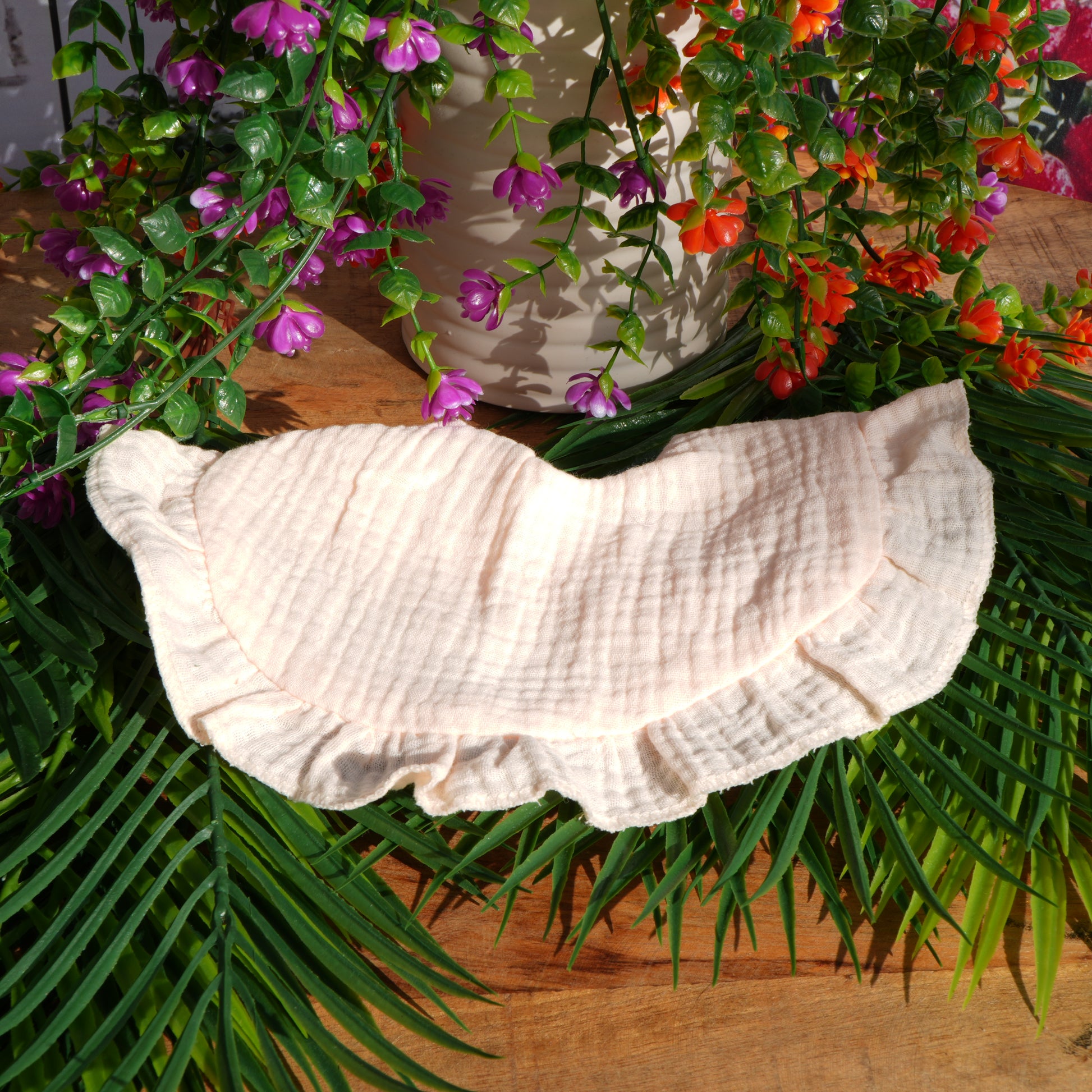 Gemaakt van zacht katoen en dubbel laags. Absorberend en afgewerkt met een ruche. en drukknoop sluiting.