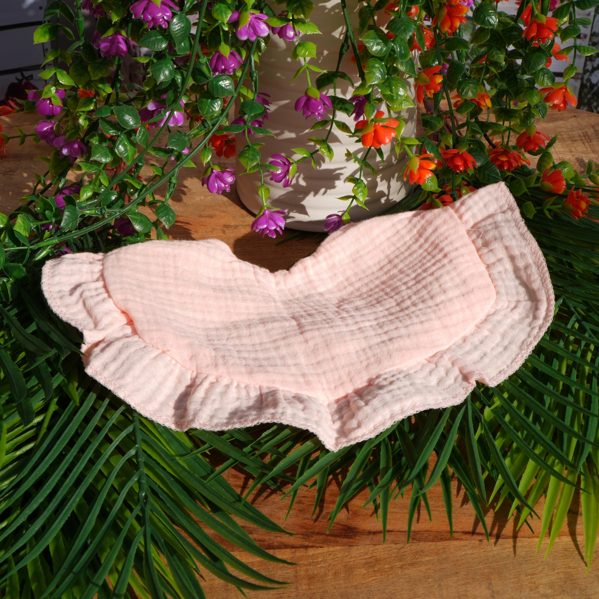 Gemaakt van zacht katoen en dubbel laags. Absorberend en afgewerkt met een ruche. en drukknoop sluiting.